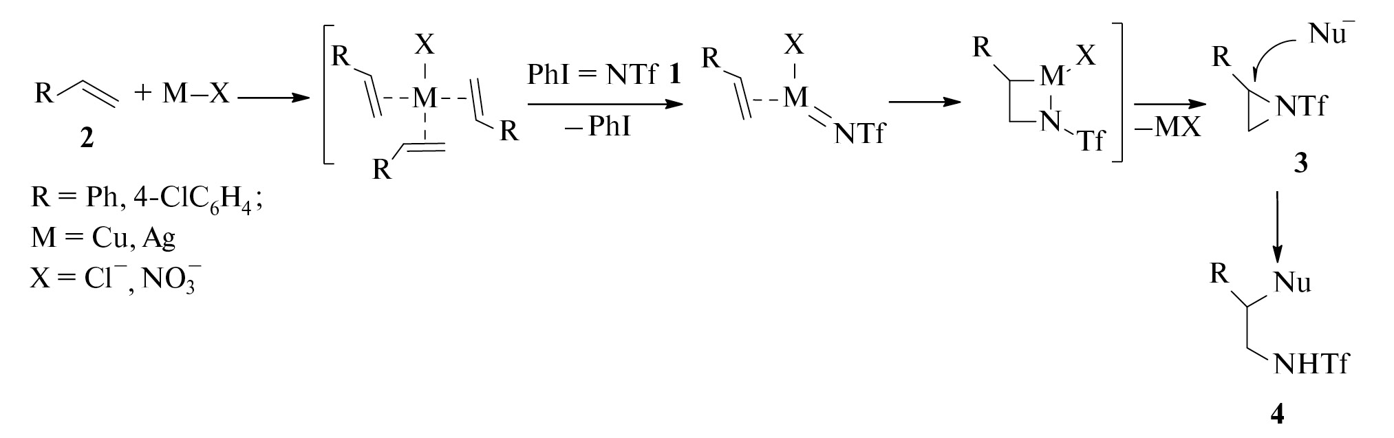 На следующей схеме предложен возможный механизм реакции (схема 6) на основе данных литературы [21]. Общий механизм включает в себя образование на первоначальной стадии комплекса “металл–алкен”, который взаимодействует с PhI=NTf (1). Полученный четырехчленный интермедиат претерпевает раскрытие кольца c образованием азиридина 3. Соединение 4 образуется под воздействием на азиридин 3 нуклеофила.