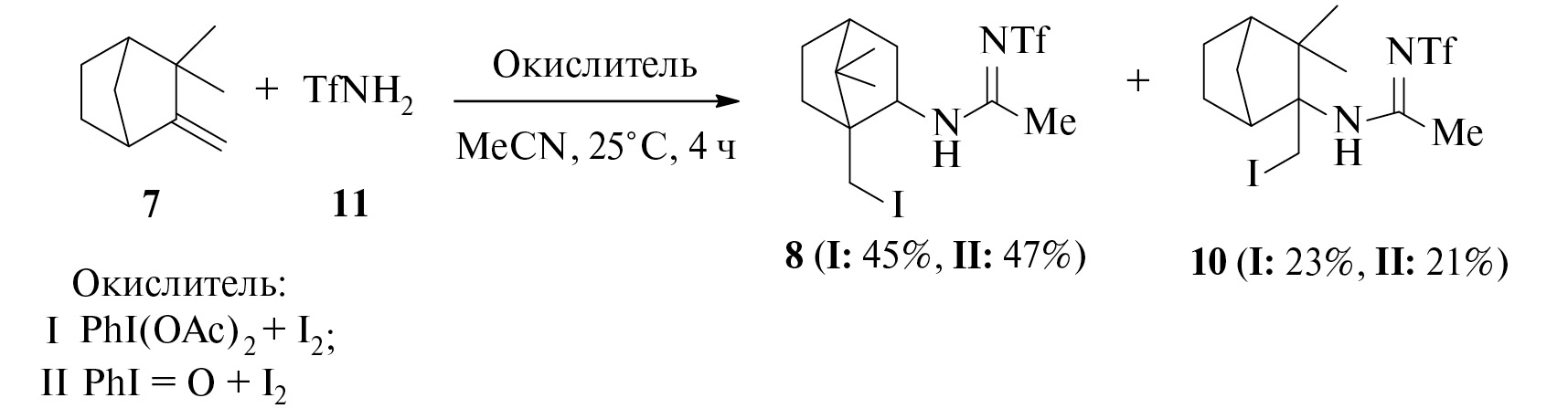 Для сравнения была проведена реакция камфена 7 с трифламидом 11 и источником трехвалентного йода в качестве окислителя в среде ацетонитрила (схема 9). Реакция камфена с трифламидом 11 в присутствии окислительных систем PhI(OAc)2+I2 (I) или PhI=O+I2 (II) приводит к смеси изомерных йодных ацетамидинов 8 и 10 в соотношении ~ 2:1.