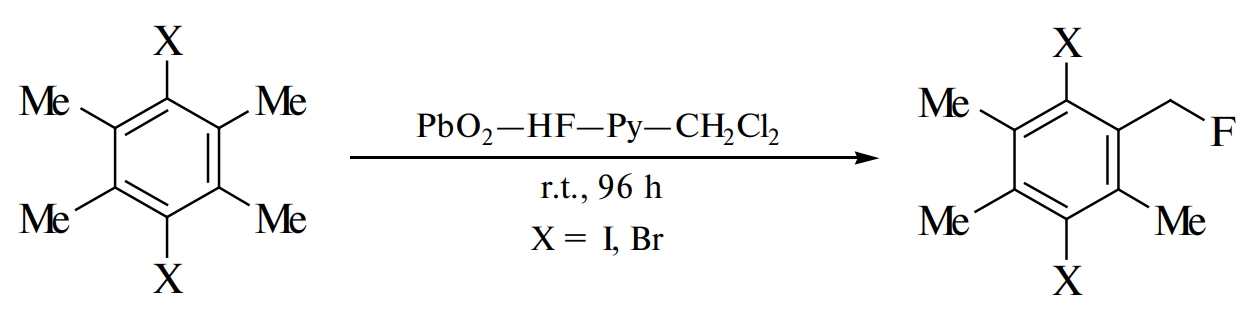 Окисление 1,4-дииод-2,3,5,6-тетраметилбензола (дииоддурола) и 1,4-дибром-2,3,5,6-тетраметилбензола (дибромдурола) диоксидом свинца PbO₂ в “реагенте Ола”, смеси фтористого водорода и пиридина, и CH₂Cl₂ в качестве сорастворителя при комнатной температуре в течение 96 ч приводит к образованию соответствующих продуктов монофторирования метильной группы. Это первый пример использования окислительной системы PbO₂–HF–Py–CH₂Cl₂ для монофторирования боковой цепи метилзамещенных бензолов.