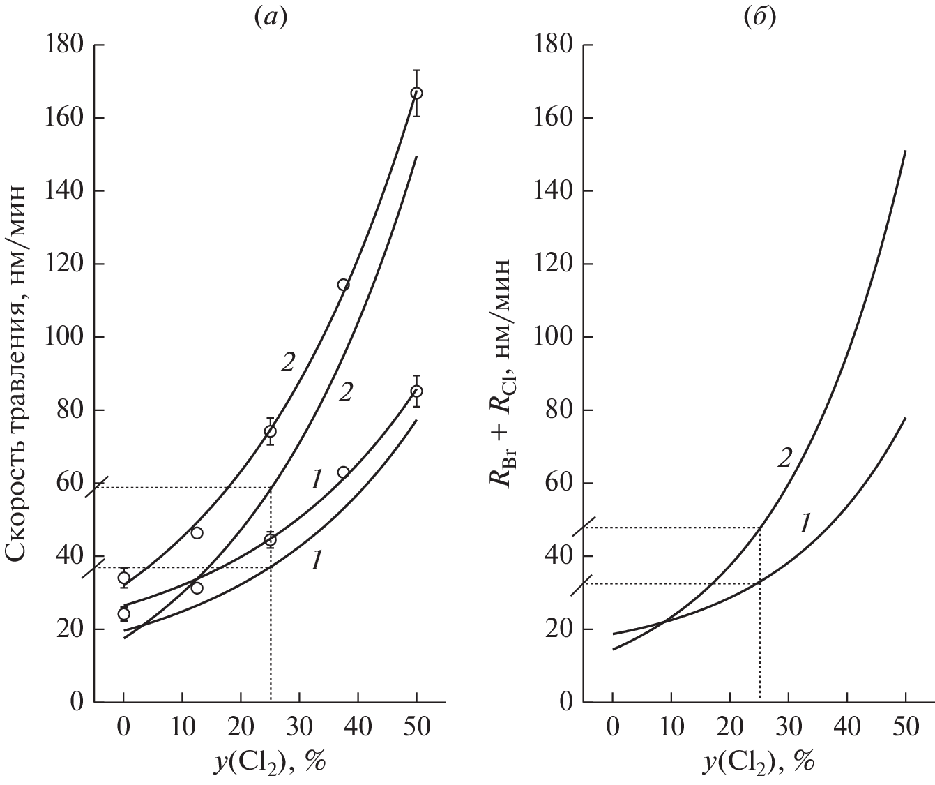 Проведено исследование параметров газовой фазы и кинетики реактивно-ионного травления SiO2 и Si3N4 в условиях индукционного ВЧ (13.56 МГц) разряда при варьировании соотношения HBr/Cl2. Схема исследования включала диагностику плазмы зондами Ленгмюра, моделирование плазмы с целью нахождения стационарных концентраций активных частиц, а также измерение скоростей и анализ механизмов травления в приближении эффективной вероятности взаимодействия. Установлено, что замещение HBr на Cl2 при постоянном содержании аргона: а) сопровождается заметным изменением электрофизических параметров плазмы; б) приводит к слабому росту интенсивности ионной бомбардировки обрабатываемой поверхности; и в) вызывает значительное увеличение суммарной концентрации и плотности потока химически активных частиц. Показано, что скорости травления SiO2 и Si3N4 монотонно возрастают с ростом доли Cl2 в смеси, при этом основным механизмом травления является ионно-стимулированная химическая реакция. Модельное описание кинетики такой реакции в первом приближении предполагает а) аддитивный вклад атомов брома и хлора; и б) прямо-пропорциональную зависимость их эффективных вероятностей взаимодействия от интенсивности ионной бомбардировки. Предположено существование дополнительного канала гетерогенного взаимодействия с участием молекул HCl.