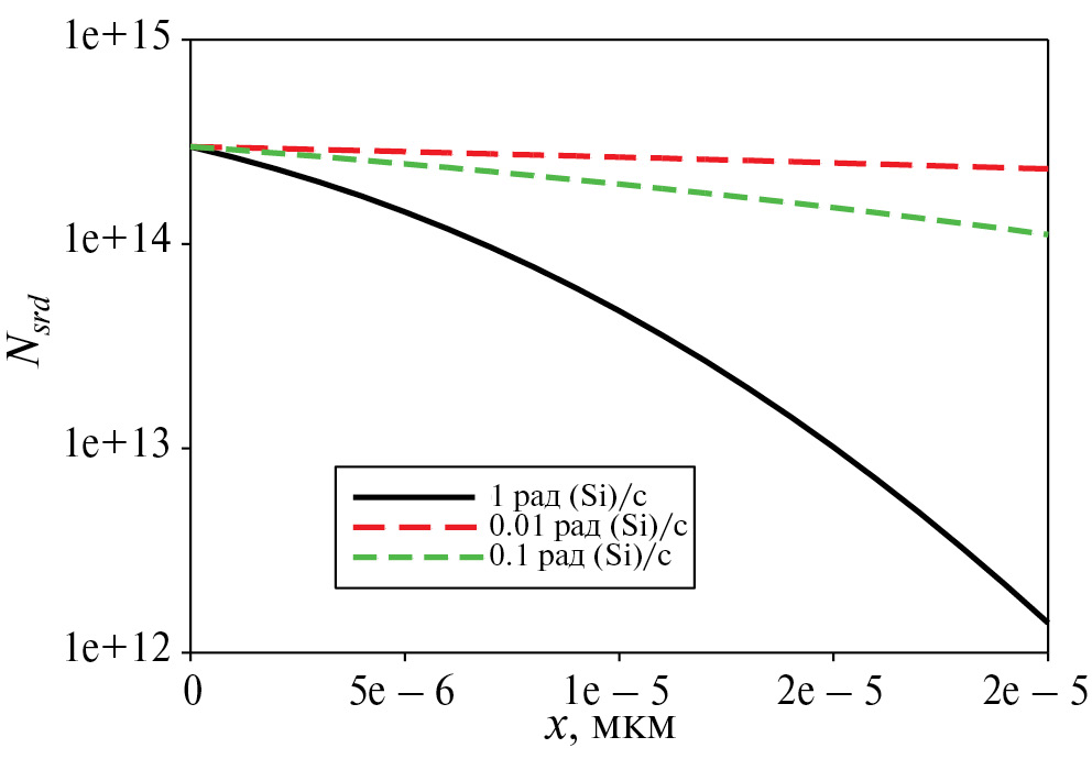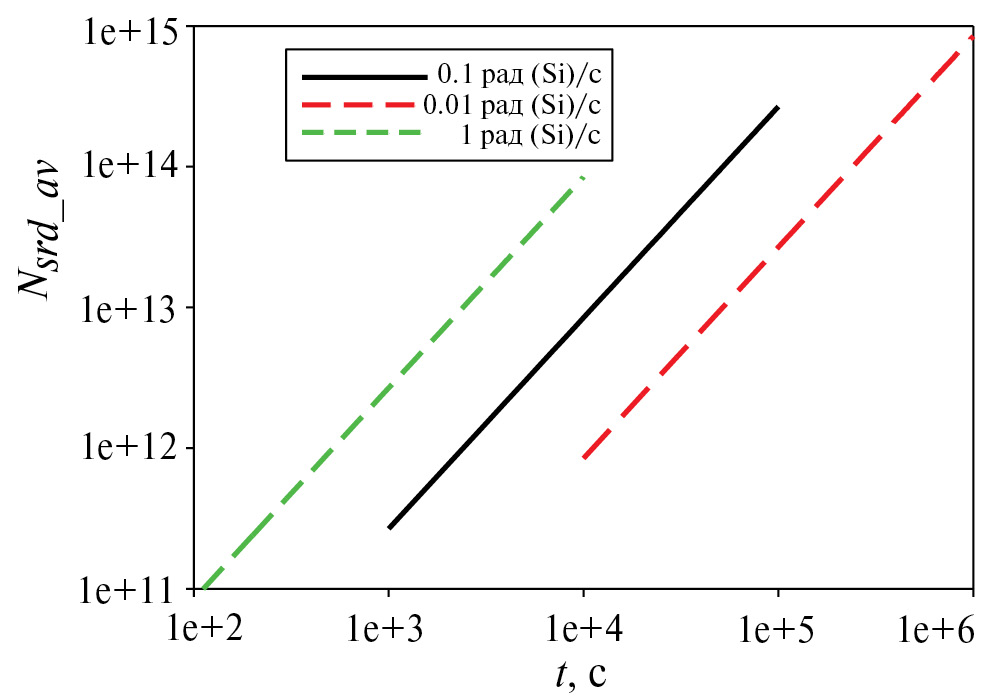 На рис. 2 представлены графики зависимостей изменений усредненных концентраций первичных РД от времени при различных мощностях дозы для чувствительной области шириной 0.2 мкм. При оценках использовались следующие величины: gsrd = 3 ×1010 пар/(рад(Si) × см³), коэффициент диффузии 10–14 см²/с и суммарная поглощенная доза 10 крад(Si). Нетрудно заметить, что хотя зависимости ведут себя практически одинаково, конечное значение усредненной концентрации РД внутри чувствительной области имеет максимальное значение при наименьшем значении мощности поглощенной дозы. В рассматриваемом примере при достижении интенсивности излучения менее 0.1 мрад(Si)/с изменение средней концентрации фактически уже не изменяется, что свидетельствует о насыщении в изменении деградации от Pγ.