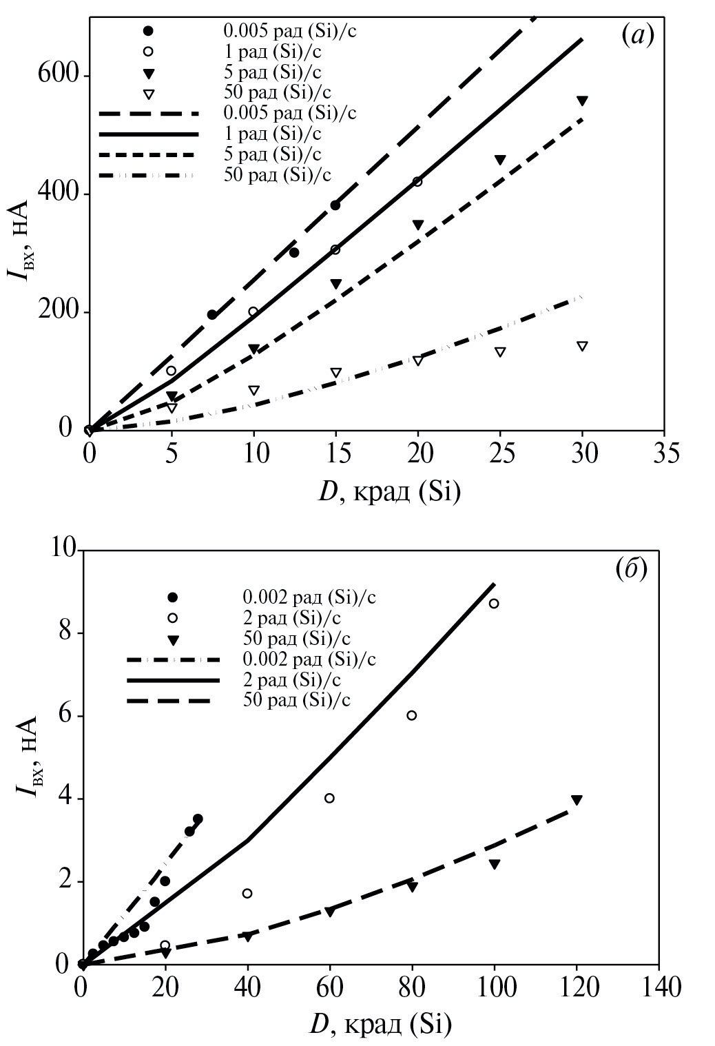 Тем не менее там, где эффекты ELDRS проявляются явно, можно пренебречь составляющей ∆Is и оценки проводить только с учетом ∆Igp. На рис. 5 в качестве примера представлено сравнение расчетных и экспериментальных зависимостей [5] с использованием предлагаемой модели. При оценках предполагалось, что
