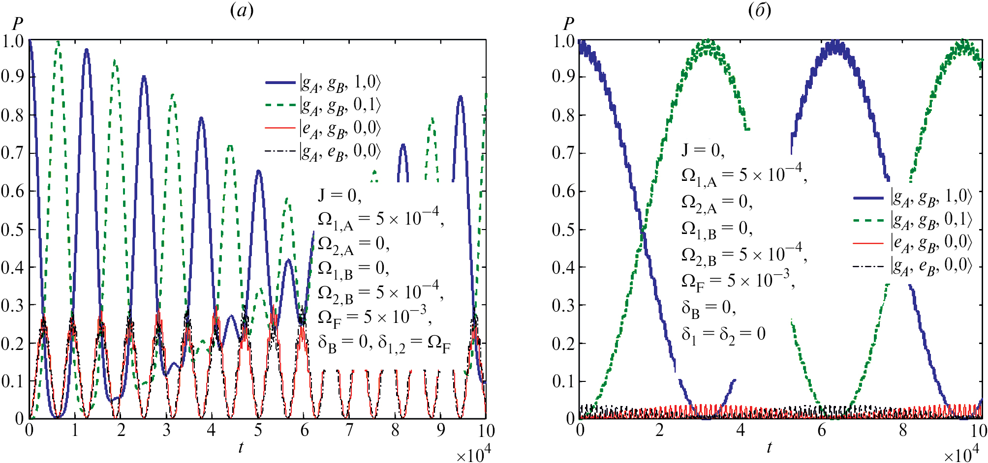 Рис. 2. Графики зависимостей заселенностей базисных состояний от времени для схемы непрямого переноса фотона между волноводами контролируемого кубита через КТ А. Учитывается нежелательный эффект прямого фотонного туннелирования с малыми (а) и промежуточными (б) скоростями J. Все параметры даны в единицах частоты оптического перехода в КТ