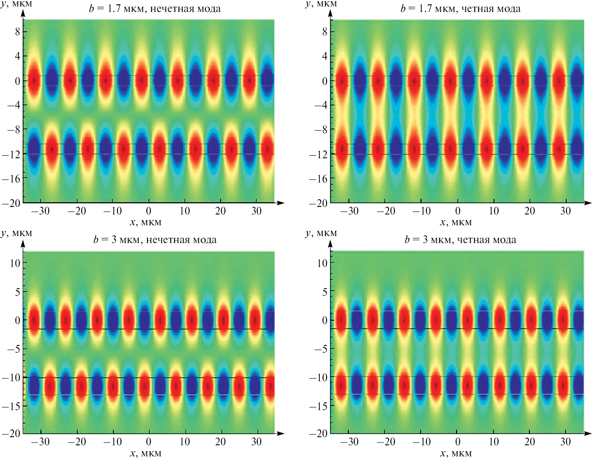 Рис. 5. Графики двумерного распределения электрического поля двух волноводов толщиной h = 1.77 мкм и шириной b = 1.7 мкм при L = 9.5 мкм (вверху) и b = 3 мкм при L = 8.5 мкм (внизу) для нечетной (слева) и четной (справа) х-мод. Горизонтальными линиями обозначены границы волноводов