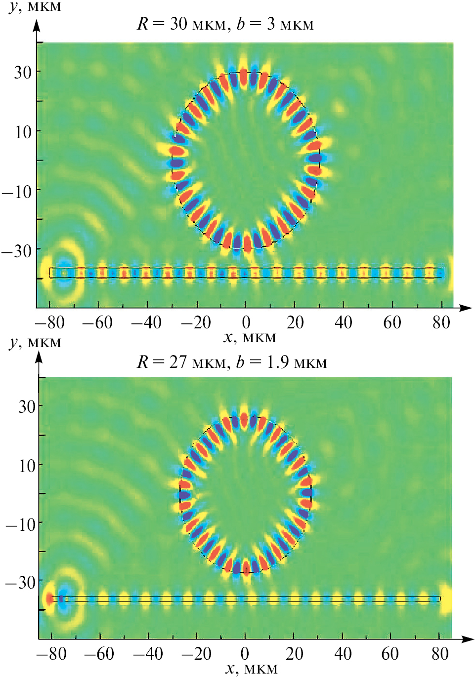 Рис. 7. Графики двумерного распределения электрического поля x-моды системы, состоящей из микродиска с радиусом R и волновода с шириной b. Волновод находится на расстоянии d от микродиска. Вверху: R = 30 мкм, b = 3 мкм, d = 6.5 мкм, внизу: R = 27 мкм, b = 1.9 мкм, d = 8 мкм