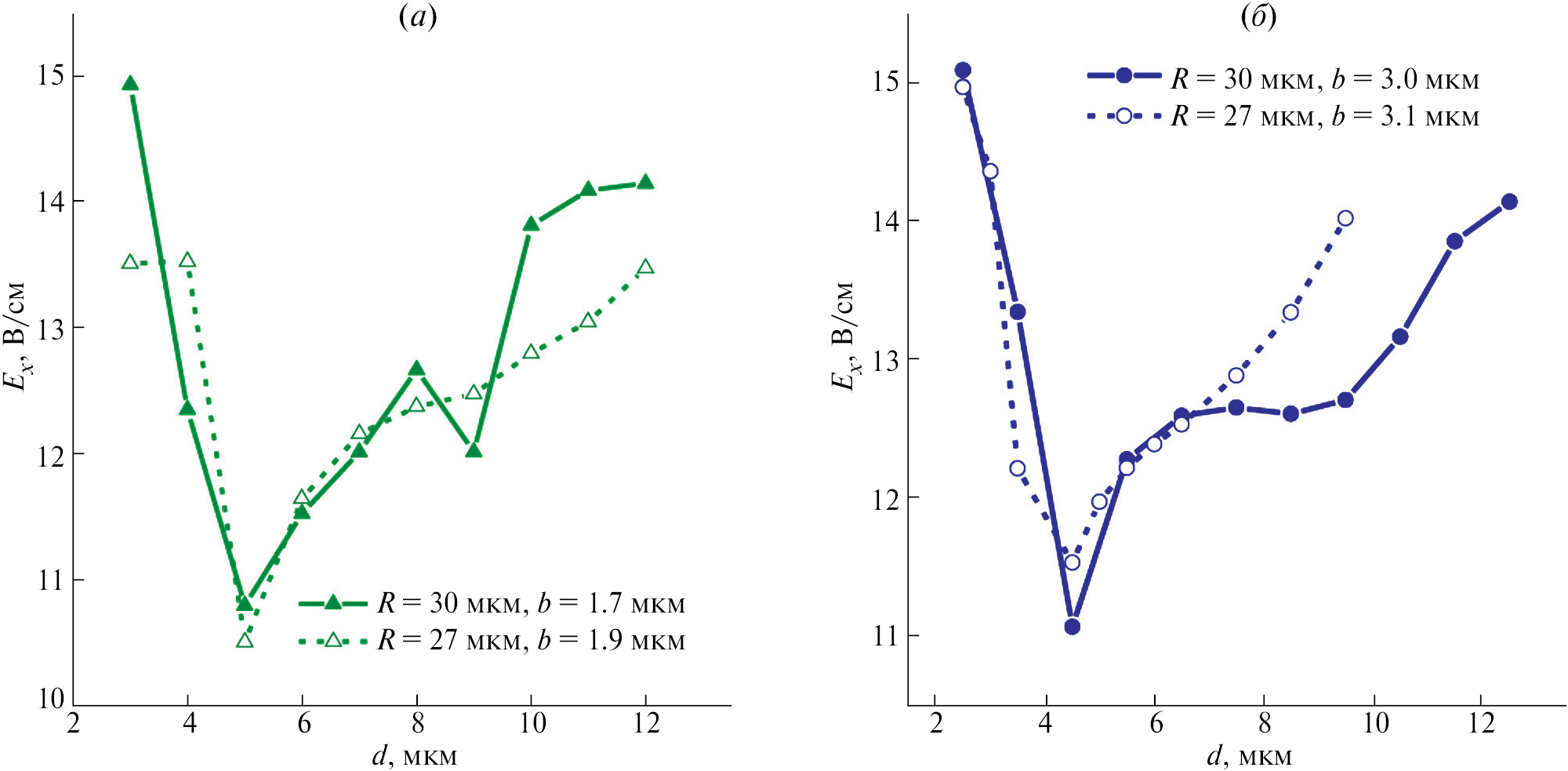 Рис. 8. Графики зависимостей максимального значения Еx однофотонного электрического поля для x-моды МР от расстояния d между волноводом и микродиском для тонкого волновода (а) и волновода умеренной ширины (б)