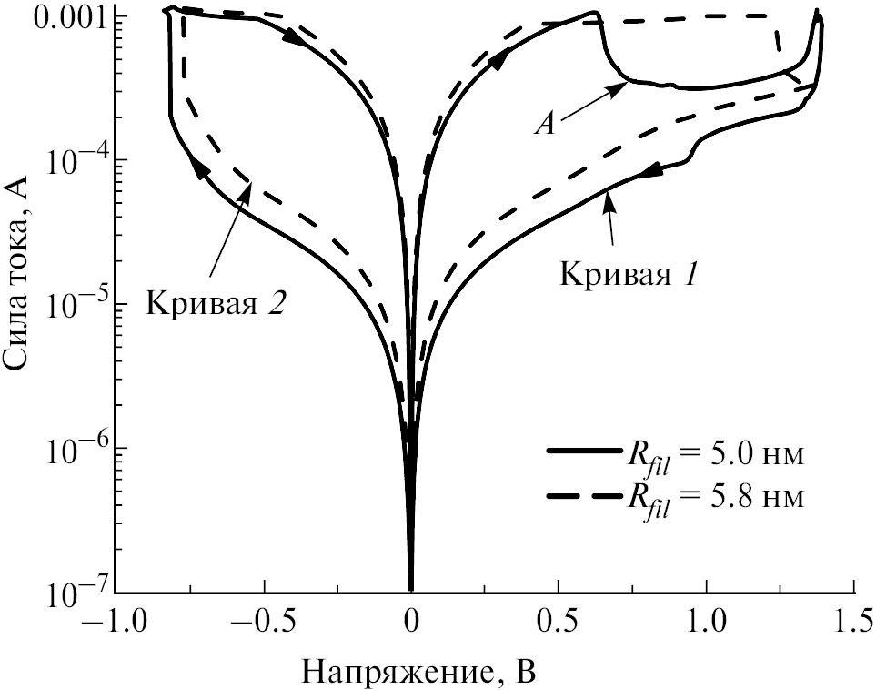 Моделирование проводилось для условий, когда ток в состоянии LRS ограничивается внешним источником, что соответствует реальному эксперименту по снятию ВАХ мемристоров. В результате расчетов по предлагаемой модели была построена вольт-амперная характеристика, изображенная на рис. 2 (кривая 1), находящаяся в хорошем согласии с экспериментальной работой [19]. Модель описывает особенность (А) на кривой ВАХ во время операции RESET, имеющую участок отрицательного дифференциального сопротивления (область 0.6–1.4 В на рис. 2). Аналогичная особенность также наблюдалась в работах [20–24].