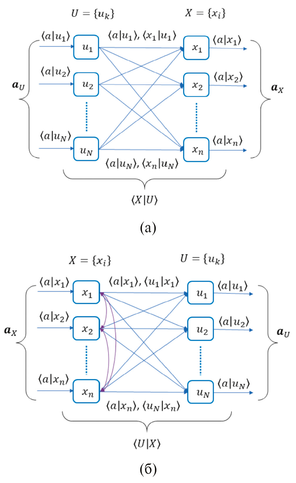 а) 𝒂𝑈 = ⟨𝑈|𝑋⟩ 𝒂𝑋, б) 𝒂𝑊 = ⟨𝑊|𝑈⟩ 𝒂𝑈,