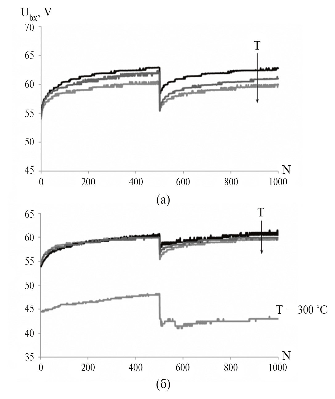 Рис. 1. Экспериментальные данные: изменение напряжения пробоя (Ubr) от количества циклов N при разных температурах: а) сверху – вниз – T = -60°C, 0°C, 25°C; б) сверху – вниз – T = 225°C, 125°C, 25°C; нижняя кривая – T = 300°C.
