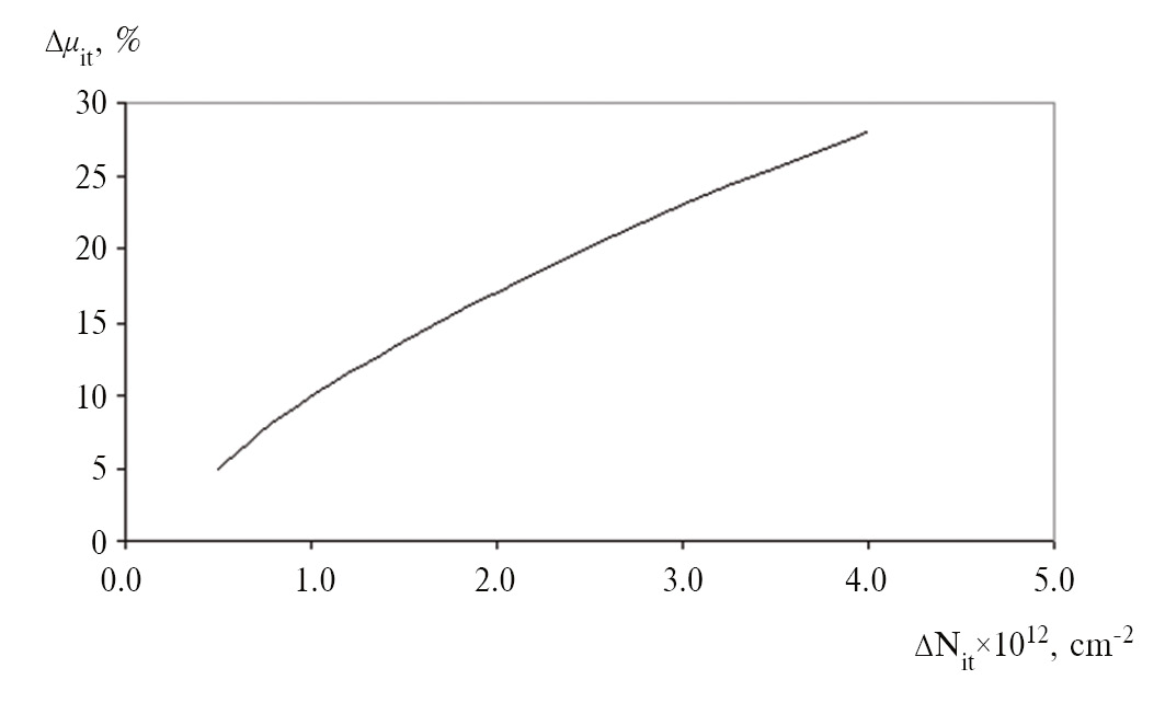 Встраивание заряженных дефектов оказывает двойственное влияние на электрофизические характеристики транзистора: они вызывают локальные искажения электростатики прибора и играют роль заряженных рассеивающих центров. В данном случае происходит уменьшение подвижности носителей и, следовательно, тока стока и проводимости транзистора в подпороговом и линейном режимах. Деградация подвижности описывается эмпирической формулой [25; 26]: