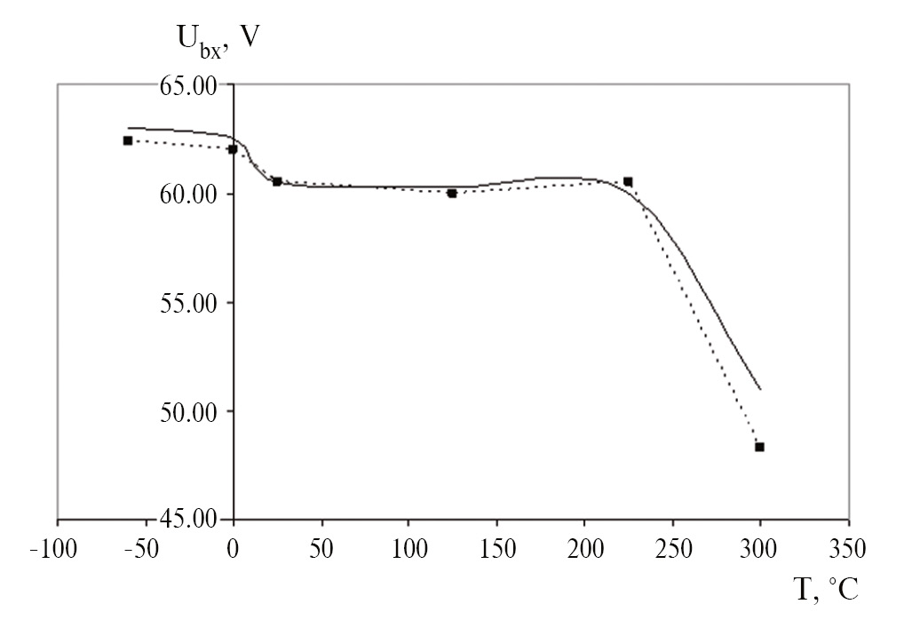 Аналогично предыдущим результатам, на зависимости DUbr(T) можно выделить температурный диапазон от 30 до 220 °C где приращение постоянно и составляет примерно 2.3 В.