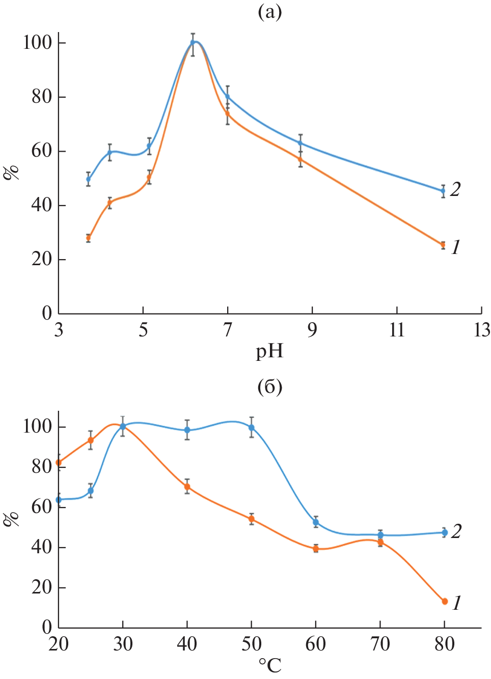 Glucose oxidase from Aspergillus niger was immobilized by covalent cross-linking on the surface of alginate microspheres obtained by emulsification/internal gelation method. The catalytic properties of the free and immobilized enzyme were compared. The size of the resulting microspheres was less than 200 μm. Experiments have shown that the immobilized enzyme has an activity 40% lower than the free glucose oxidase, but it has a high activity in a wider range of temperatures and pH values. Kinetic parameters for native glucose oxidase: limit reaction rate – 0.341 mM · min–1, Michaelis constant – 5.41 mM; for immobilized: limit reaction rate – 0.203 mM · min–1, Michaelis constant – 11.43 mM. In infrared Fourier spectra of diffusion reflection of semi-products of biocatalyst synthesis, peaks corresponding to the formed covalent bonds between the enzyme and the carrier were revealed. Synthesized biocatalyst can be used in food industry as bakery improver, in chemical and pharmaceutical industry for production of gluconic acid and in analytical chemistry for determination of glucose concentration.