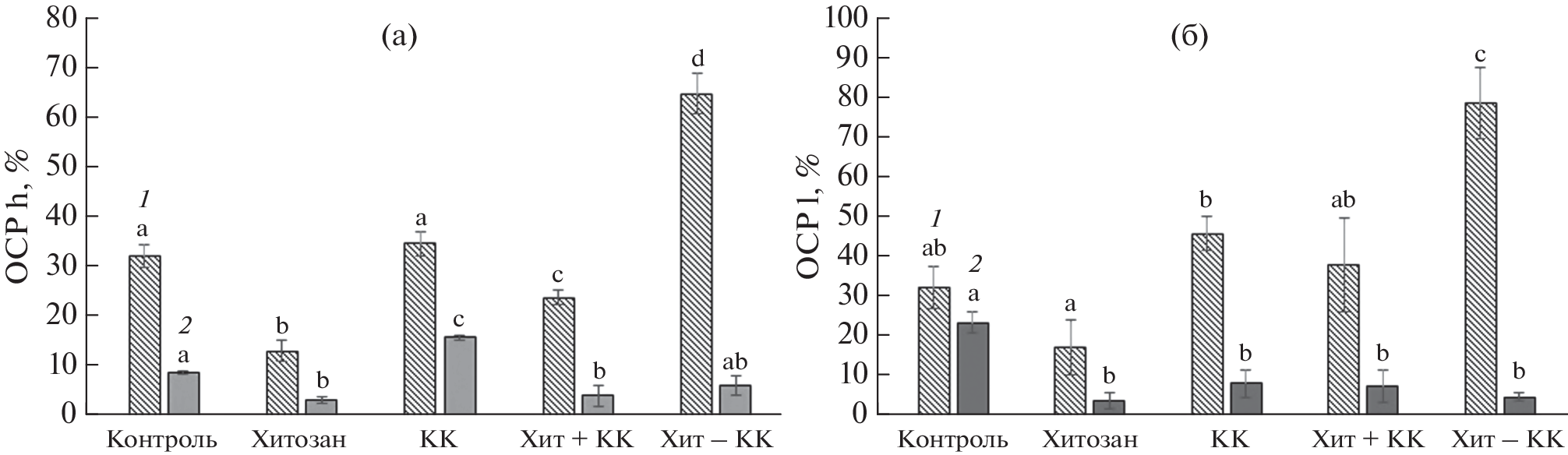 The article discusses the influence of caffeic acid (CA), its mix with chitosan (CHT + CA) and chitosan-based conjugate (CHT-CA) on growth and proline content of microclone potato plants (Solanum tuberosum L.) in in vitro culture under optimal conditions and under prolonged osmotic stress caused by polyethylene glycol. Under optimal conditions CHT-CA and CA, acting as moderate strength stressors, accelerate the growth and development of potato microclones and increase the proline accumulation in the stems. Under osmotic stress CA and CHT-CA promote the resistance of potato microclones and maintain their active growth. And such effect persists during the reparation period. The mechanical mix CHT + CA causes inhibition of microclonal plants’ growth and development accompanied by a significant accumulation of proline which is aggravated under stress.