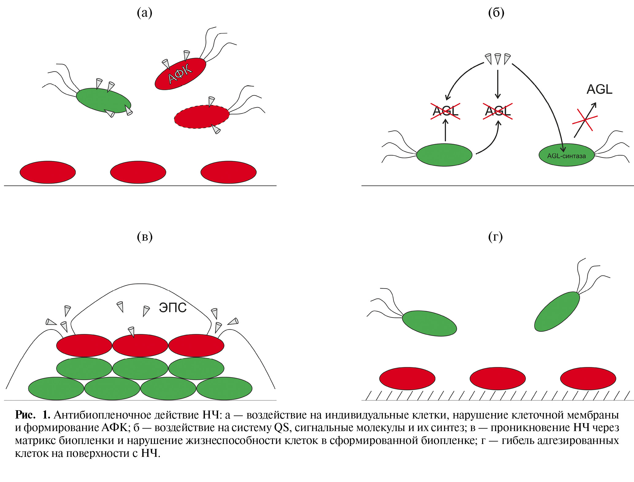 Рис. 1. Антибиопленочное действие НЧ: а — воздействие на индивидуальные клетки, нарушение клеточной мембраны и формирование АФК; б — воздействие на систему QS, сигнальные молекулы и их синтез; в — проникновение НЧ через матрикс биопленки и нарушение жизнеспособности клеток в сформированной биопленке; г — гибель адгезированных клеток на поверхности с НЧ.