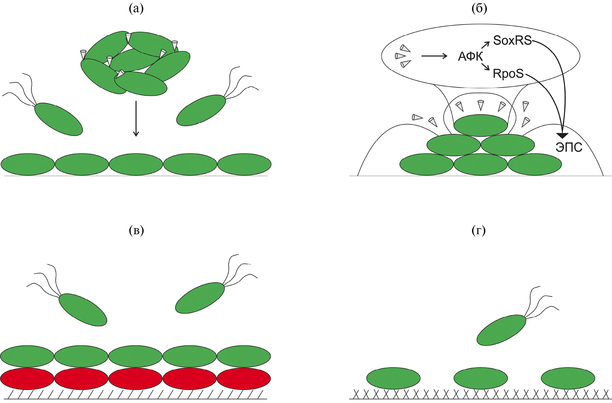 Рис. 2. Пробиопленочное действие НЧ на микроорганизмы: а — агрегация клеток с НЧ и усиление адгезии клеточных агрегатов под действием силы тяжести; б — активация генов RpoS и SoxRS регулона, приводящая к увеличению выработки ЭПС; в — формирование биопленки по принципу “живое на мертвом”; г — увеличение шероховатости, гидрофобности, пористости композитных материалов.