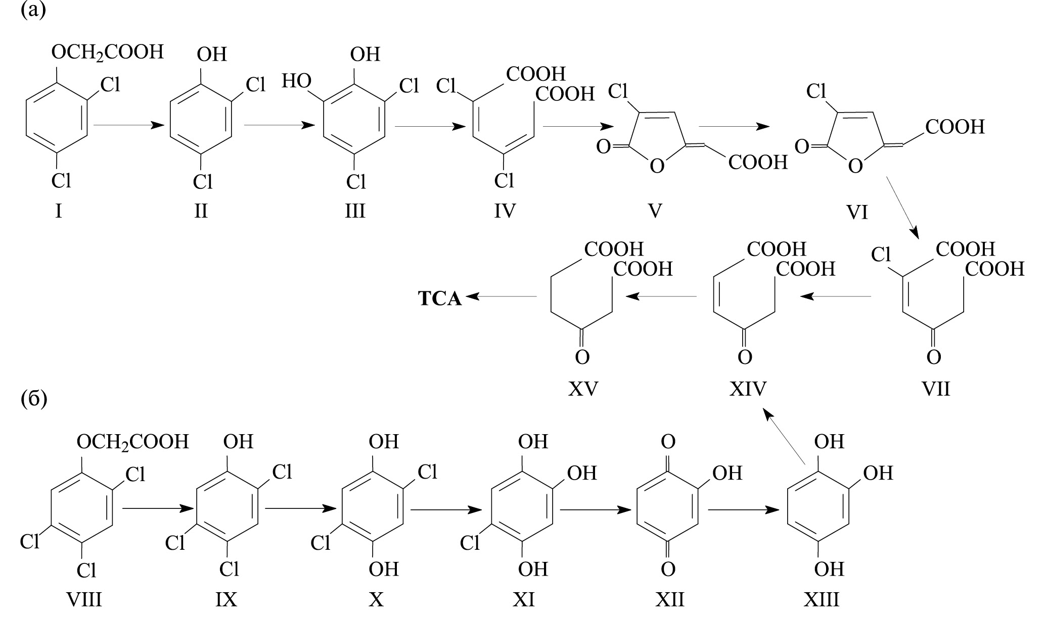 Рис. 1. Пути аэробной деградации хлорированных феноксиуксусных кислот у бактерий: а — 2,4-Д штамма C. necator JMP134 [4], б — 2,4,5-Т штамма B. phenoliruptrix АС1100 [11, 12]: I — 2,4-Д; II — 2,4-дихлорфенол; III — 2,4-дихлоркатехол; IV — 2,4-дихлор-цис, цис-муконат; V — транс-2-хлордиенлактон; VI — цис-2-хлордиенлактон; VII — 2-хлормалеилуксусная кислота; VIII — 2,4,5-Т; IX — 2,4,5-трихлорфенол; X — 2,5-дихлоргидрохинон; XI — 5-хлоргидроксигидрохинон; XII — 2-гидрокси-1,4-бензохинон; XIII — гидроксигидрохинон; XIV — малеилуксусная кислота; XV — β-кетоадипат; TCA — цикл трикарбоновых кислот.