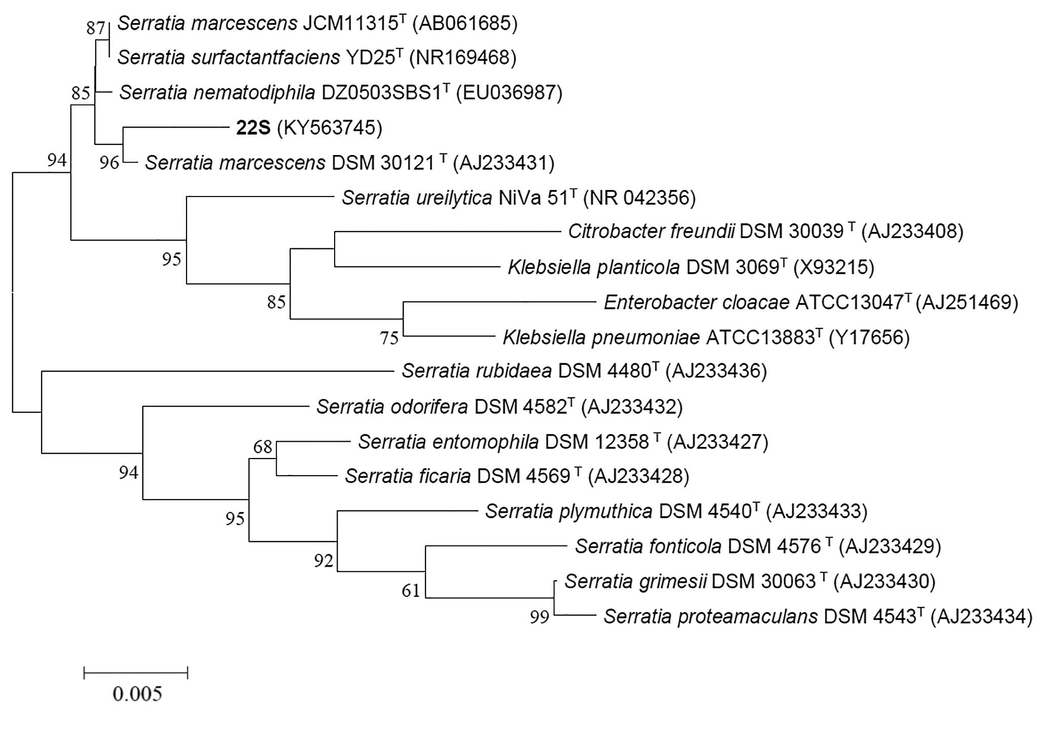 С типовым штаммом S. marcescens DSM 30121T исследуемая культура образует кластер с высоким уровнем достоверности — значение бутстреп анализа равно 96 и уровнем идентичности — 98.5%. Последний сопоставим по значению (98.4 и 98.3% соответственно) с уровнями идентичности штамма 22S и типовых штаммов двух других видов S. nematodiphila DZ0503SBS1T и S. surfactantfaciens YD25T.