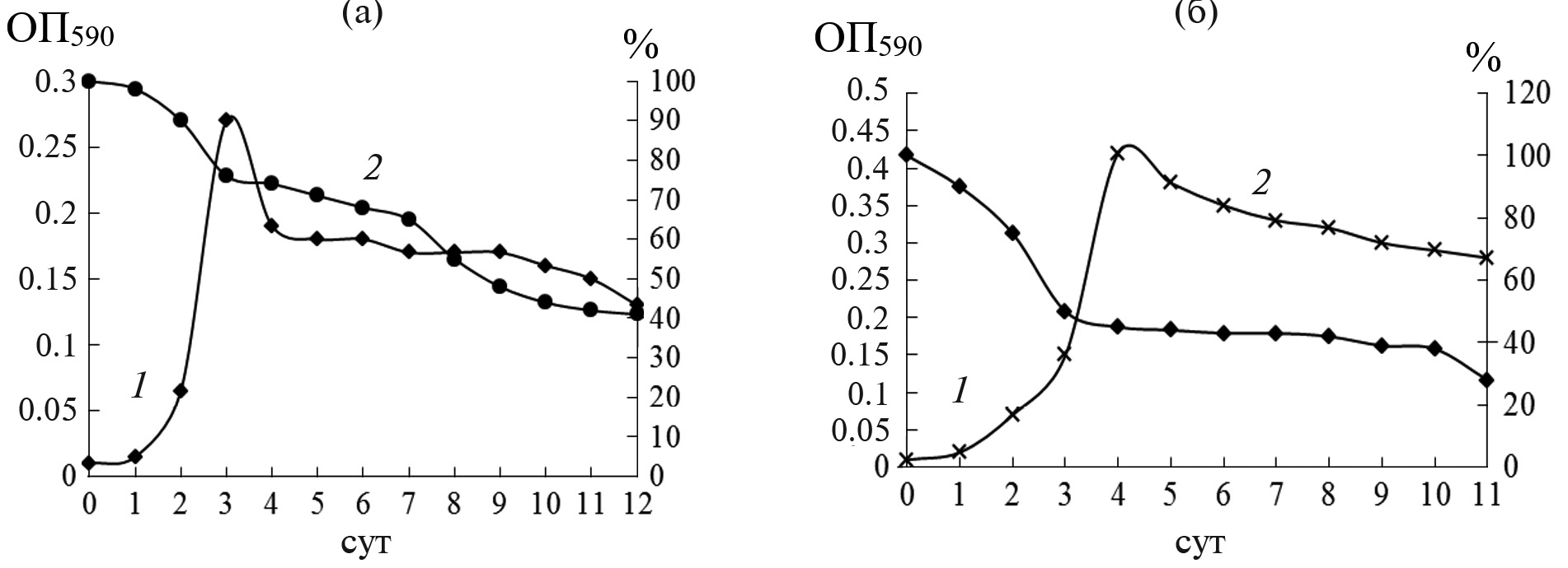 Рис. 3. Зависимость ОП590 (1) культуральной жидкости и концентрации 2,4-Д (а, 2) и 2,4,5-Т (б, 2) от времени культивирования Serratia sp. 22S в периодической культуре: