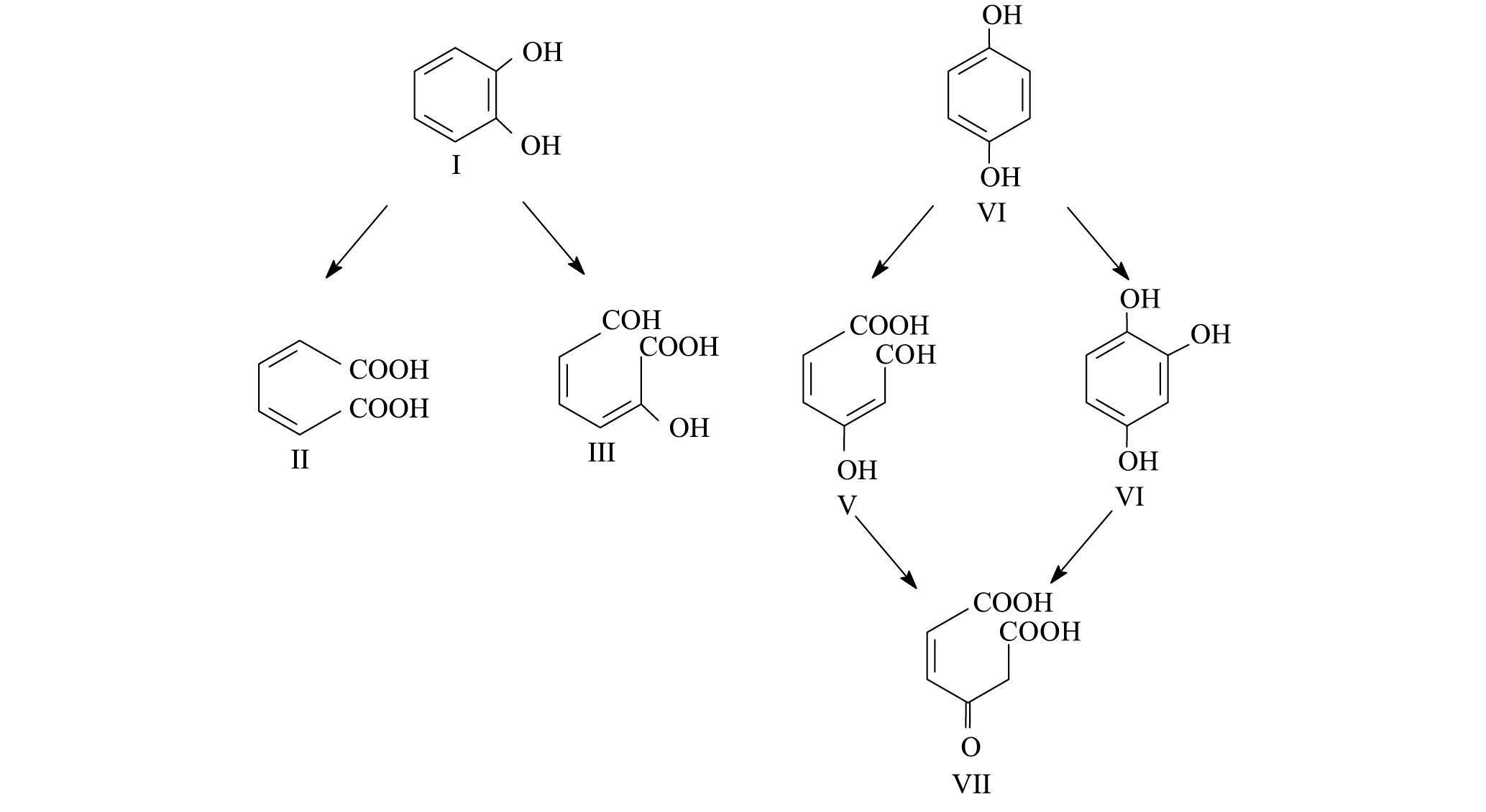 Рис. 4. Основные пути аэробного расщепления ароматического кольца катехола (а) и гидрохинона (б) [35, 36]: I — катехол, II — муконовая кислота, III — 2-гидроксимуконовый полуальдегид, IV — гидрохинон, V — 4-гидроксимуконовый полуальдегид, VI — гидроксигидрохинон, VII — 4-малеилуксусная кислота.