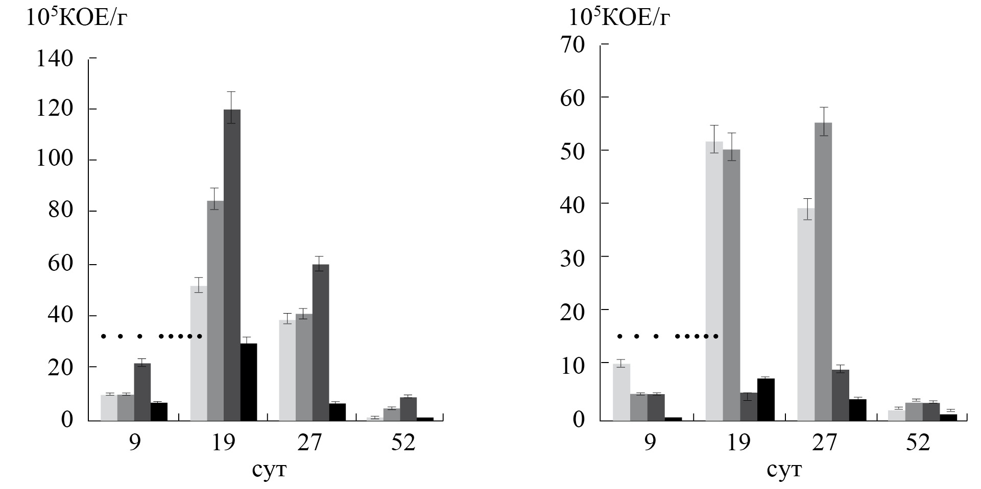 Рис. 5. Численность клеток штамма Serratia sp. 22S (КОЕ) в чистой (1) и загрязненной 2,4,5-Т (а) и 2,4-Д (б) почве при 100 ПДК (2), 1000 ПДК (3) и 10000 ПКД (4).