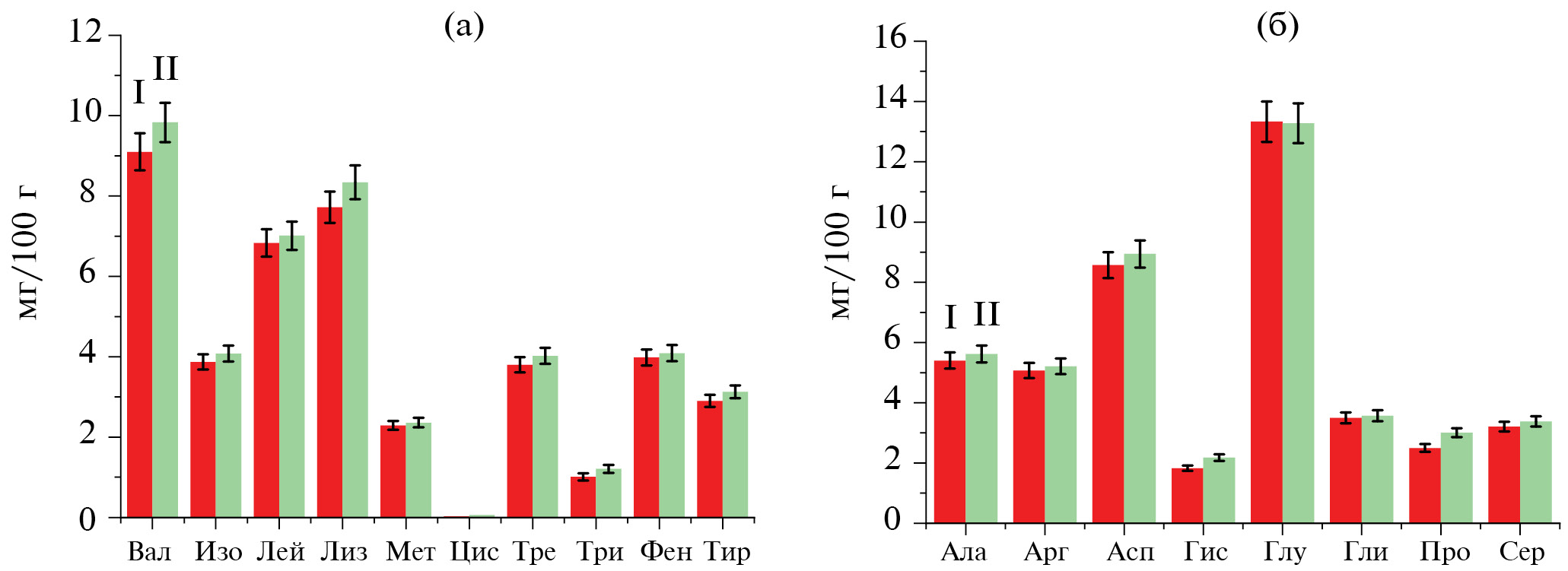 Рис. 1. Содержание незаменимых (а) и заменимых аминокислот (б) в белках образцов кеты № 5 (I) и № 10 (II) (среднее арифметическое ± среднеквадратичное отклонение).
