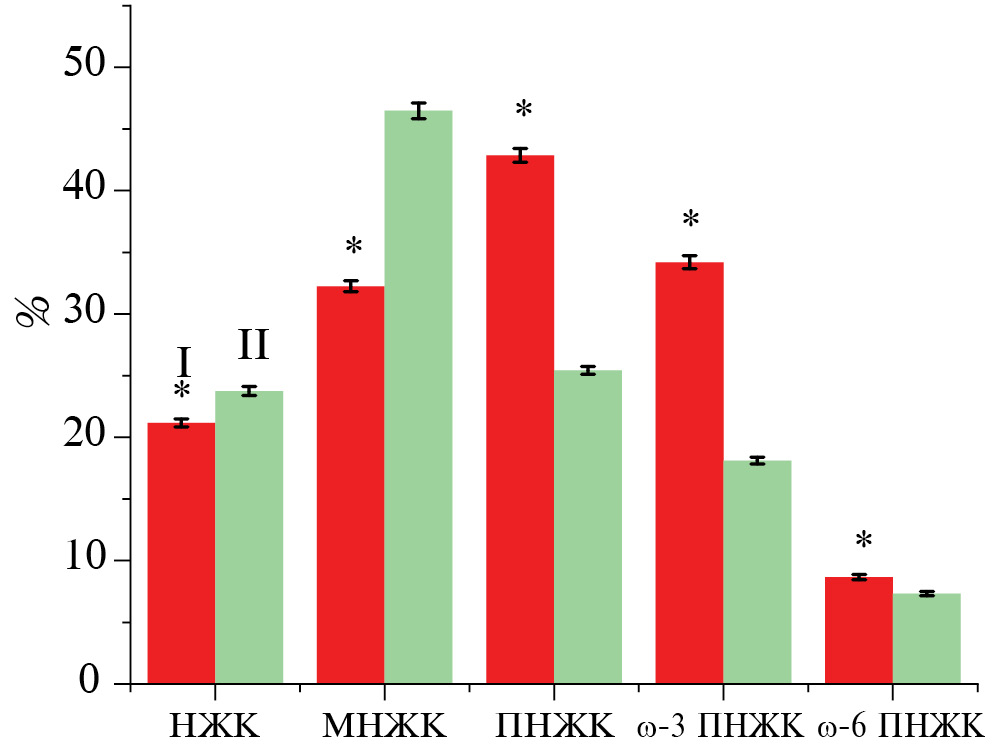Анализ жирнокислотного состава липидов (рис. 2) показал, что происходило изменение степени насыщенности жиров, которое выражалось в увеличении относительного содержания ненасыщенных кислот при истощении рыбы в период интенсивного развития гонад и нереста, что согласовывалось с ранее проведенными исследованиями [20]. Из представленных данных видно, что мышечная ткань кеты с нерестовыми изменениями содержала значительное количество омега-3 ПНЖК, около 30% от суммы жирных кислот, что было выше, чем в кете “серебрянке”. Вследствие высокой ненасыщенности жира, который содержался в мясе кеты с нерестовыми изменениями, он легко подвергался окислению и полимеризации, что должно учитываться при обеспечении условий хранения сырья.