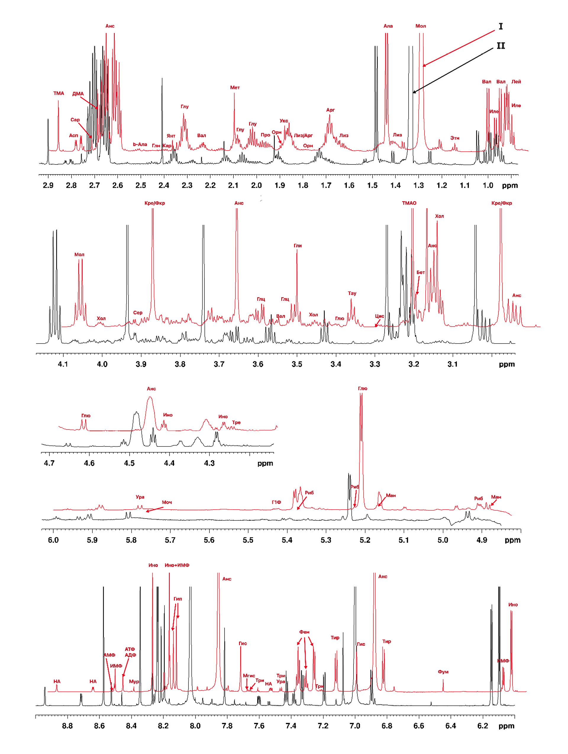 Г1Ф — глюкоза-1-фосфат; Гип — гипоксантин; ДМА — диметиламин; Кре — креатин; Мгис — метилгистидин; Мур — муравьиная кислота; ТМА — триметиламин; ТМАО — триметиламиноксид; Фкр — креатинфосфат.