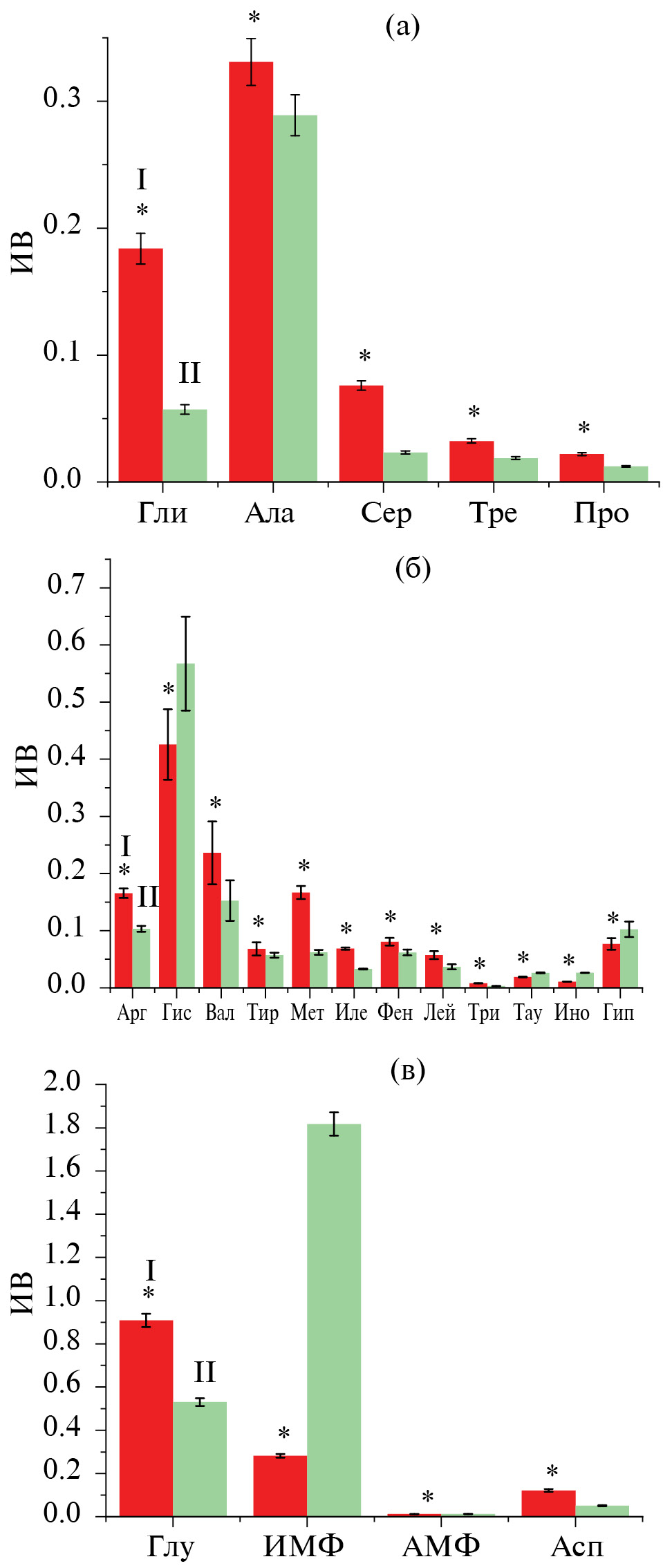 Для оценки вклада основных метаболитов в насыщенность вкуса образцов мышечной ткани проведен расчет индекса вкуса (ИВ) каждого метаболита путем отношения содержания соединения к значению порога его вкуса [24]. Порог вкуса свободных аминокислот в соответствии с литературными данными широко используется для комплексной оценки различной пищевой продукции [25].