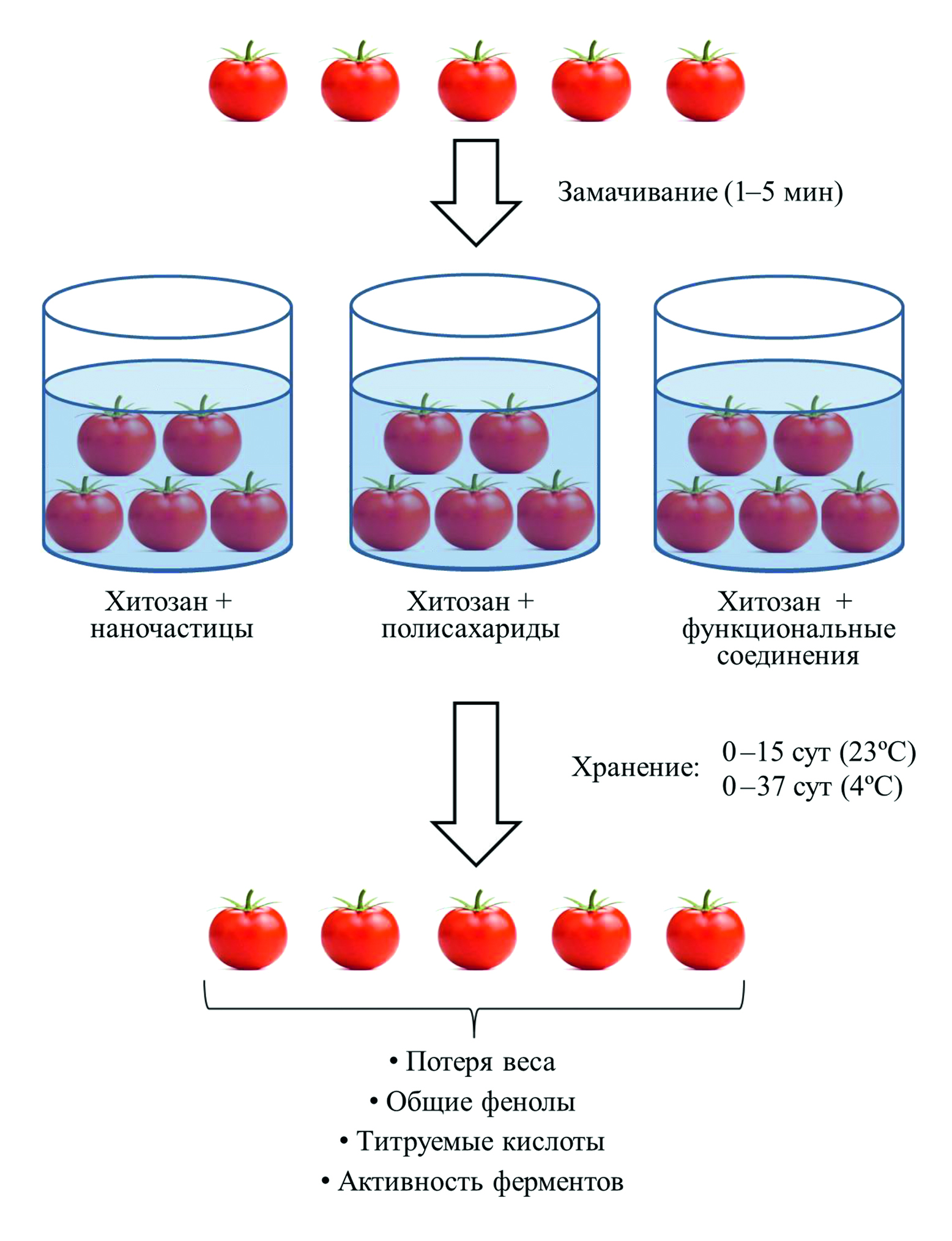 Авторы в своих исследованиях для формирования покрытий из пленкообразующих растворов в основном использовали хитозан ракообразных в концентрации 1% в 1%-ной уксусной кислоте со средней ММ, в некоторых работах использовали хитозан с низкой ММ и преимущественно со степенью дезацетилирования 75–85%. Обработку плодов томата чаще осуществляли методом погружения в пленкообразующий раствор на несколько минут в обычных условиях.