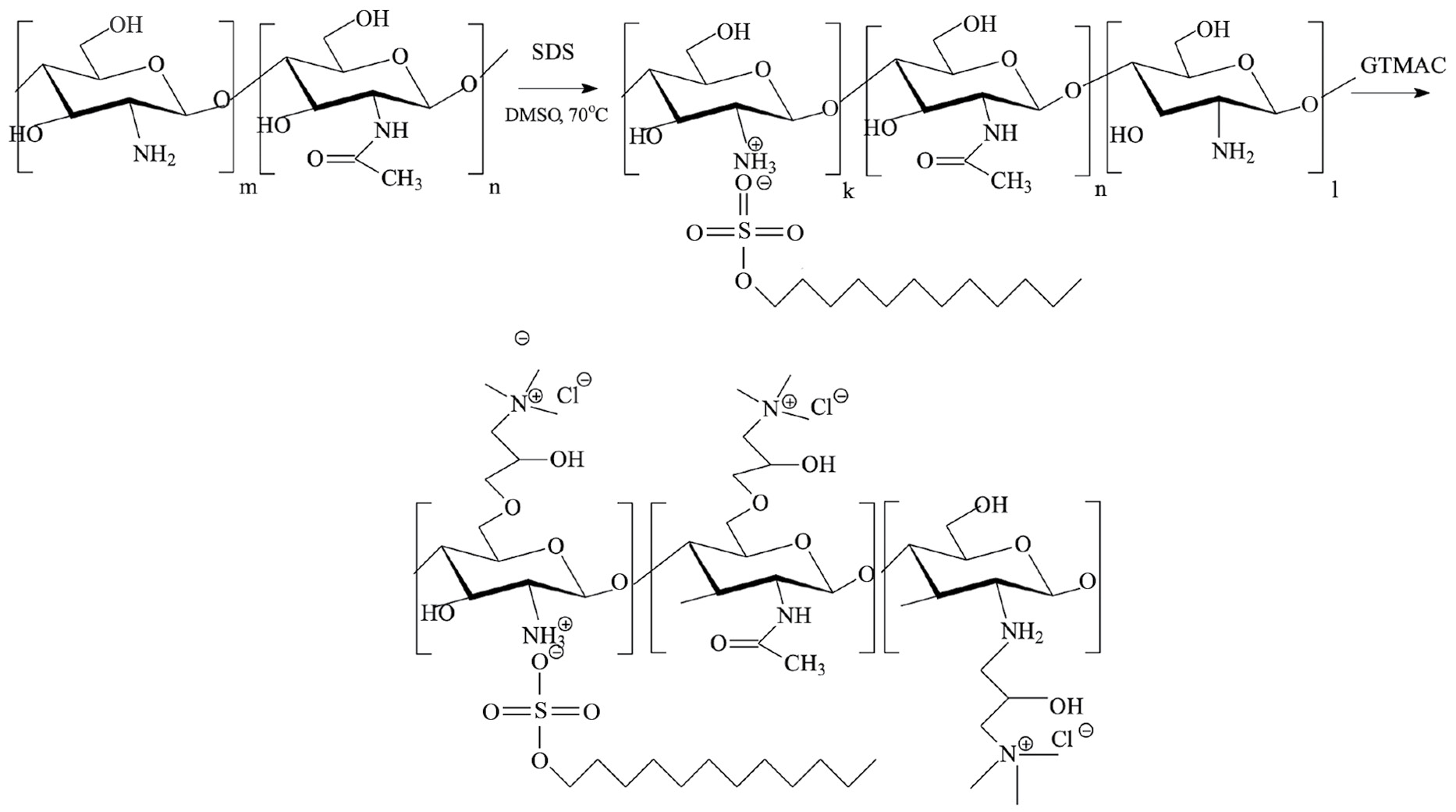 Синтез О- и N, O-кватернизованных хитозанов. К раствору комплекса ДДС/ХТЗ (1.0 г) в 40 мл ДМСО добавляли ГТМАХ равными порциями по 0.7 мл 3 раза с интервалом 2 ч. Реакцию проводили в термостатируемом ректоре при температуре 70С и непрерывном перемешивании в течение 14 ч; реакционную смесь выдерживали при 4С 12 ч. Осадок собирали с помощью центрифугирования при 5000 об/мин, 15 мин. Продукт промывали этанолом, осаждали на центрифуге, декантировали жидкую фазу; промывку осадка этанолом повторяли 4–5 раз. После сушки продукт растворяли в 16 мл 0.7 н раствора NaOH и осаждали этанолом (70 мл), собирали осадок с помощью центрифугирования, подсушивали. Повторно переосаждали продукт из щелочного раствора этанолом и высушивали. Полученный осадок растворяли в воде (20 мл). Раствор помещали в диализный мешок “SERVA MWCO 10000” (“Spectra”, США) и проводили диализ против воды, которую многократно меняли. Отмывку проводили до достижения нейтральных значений рН промывных вод; отсутствию поглощения при длине волны 230 нм в их УФ-спектрах. Раствор мХТЗ высушивали лиофильно.