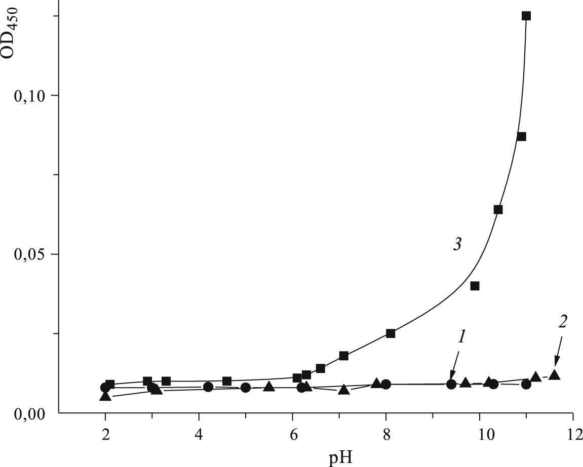 Рис. 2. Оптическая плотность при 450 нм водных растворов образцов N-мХТЗ (1), мХТЗ 1 (2), мХТЗ 3 (3) в средах с различными значениями рН.