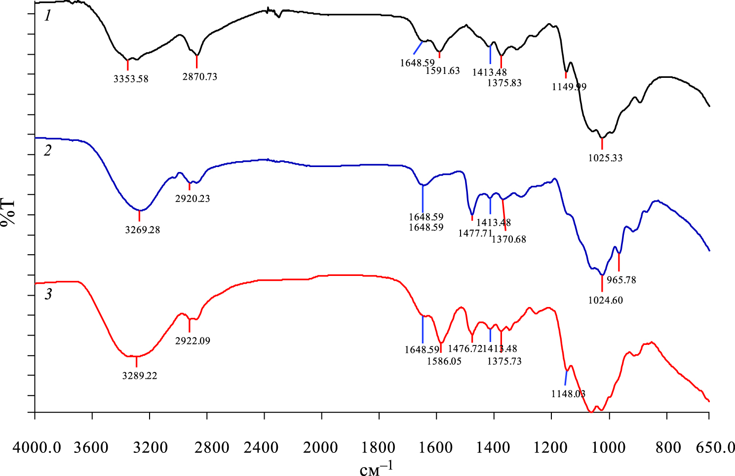 Рис. 3. ИК-Фурье-спектры образцов ХТЗ (1), N-мХТЗ (2), мХТЗ 1 (3).