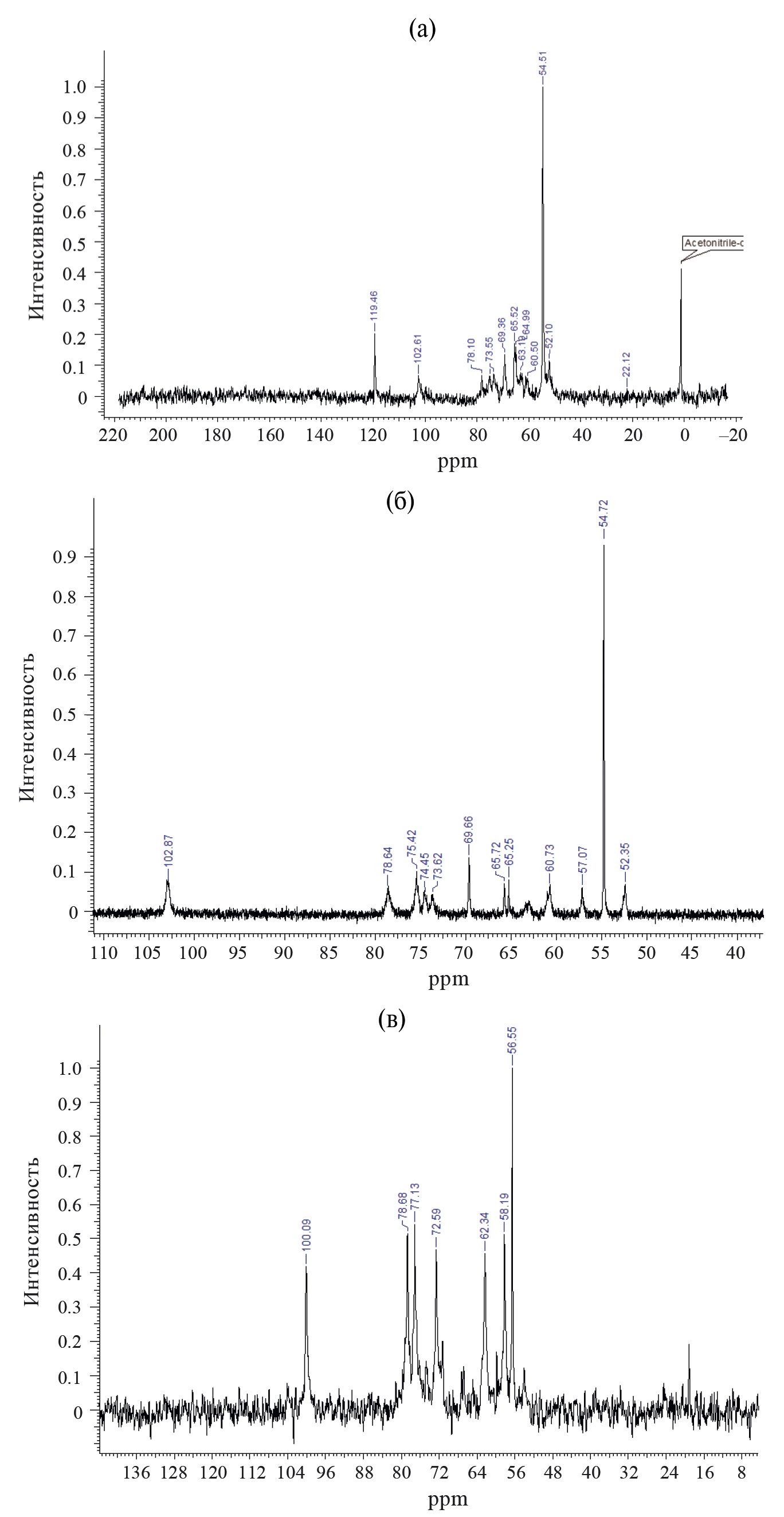 Рис. 5. Спектры ЯМР 13С модифицированных продуктов N-мХТЗ (а), мХТЗ 1 (б) и мХТЗ 3 (в) в D2O.