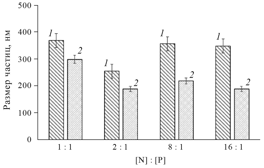 Рис. 6. Размеры частиц полиплексов, полученных при разном соотношении компонентов мХТЗ/ДНК (фосфатный буфер, рН 7.4): 1 — N-мХТЗ; 2 — мХТЗ 1.