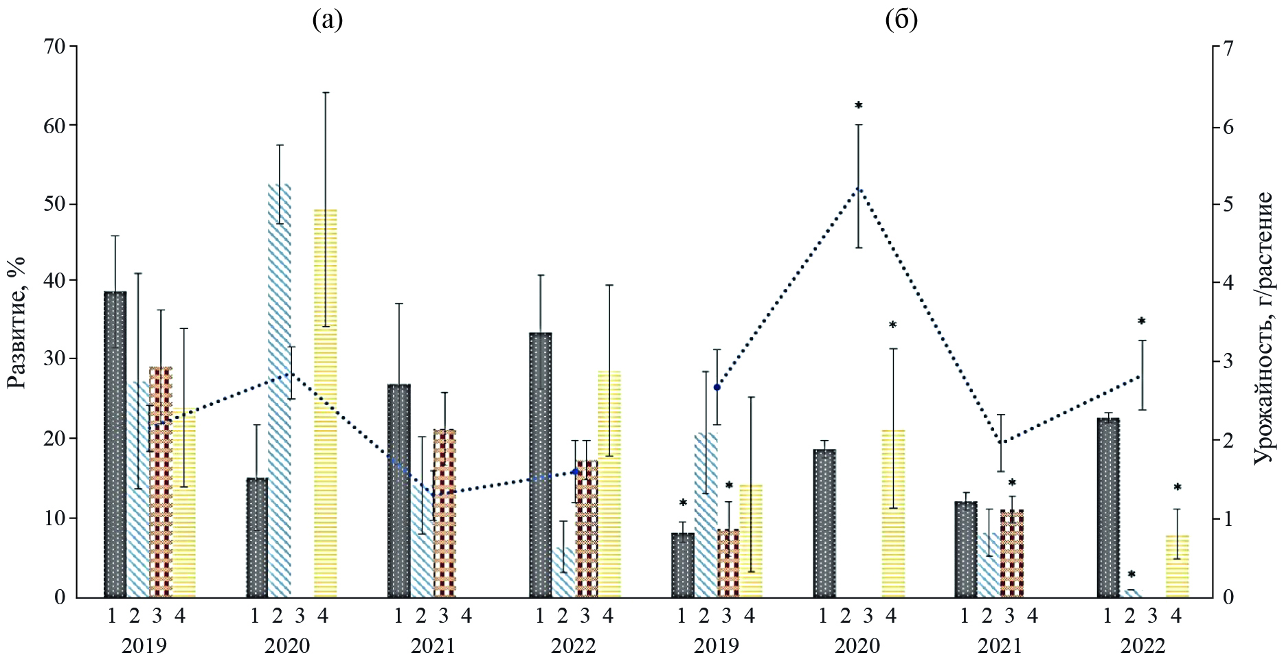 Рис. 1. Поражаемость пшеницы болезнями и ее урожайность в контрольном варианте (а) и при использовании поли-функционального комплекса B. subtilis ВКМ В 2604D + ВКМ В 2605D + 0.1% CХ (б) в 2019–2022 гг.: 1 — развитие корне-вой гнили; 2 — развитие мучнистой росы; 3 — развитие бурой ржавчины; 4 — развитие желтой ржавчины; 5 — урожай-ность пшеницы. *Различия достоверны согласно 95%-ному доверительному интервалу для средних измерений показа-теля.