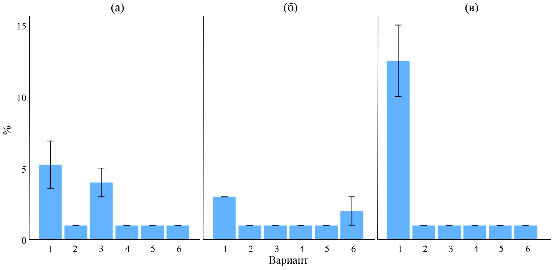Рис. 6. Интенсивность развития мучнистой росы (%) пшеницы при использовании бактериальных штаммов B. subtilis (2, 6) и полифункциональных комплексов с 0.1% СХ (4, 5), 2022 г: 1 — контроль (вода); 2 — B. subtilis ВКМ В 2604D + ВКМ В 2605D; 3 — Витаплан, СП; 4 — B. subtilis ВКМ В 2604D + ВКМ В 2605D + 0.1% CХ; 5 — B. subtilis И 5 + 0.1% СХ; 6 — B. subtilis И 5 (а, б, в — повторности опыта).