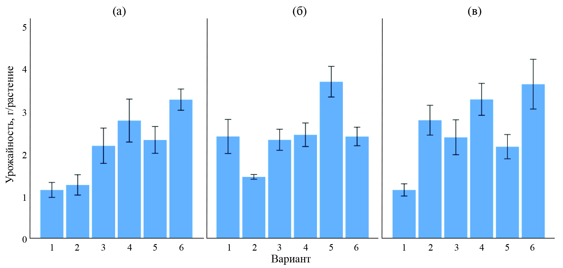 Рис. 10. Урожайность пшеницы (г/растение) при использовании бактериальных штаммов B. subtilis (2, 6) и полифункциональных комплексов с 0.1% СХ (4, 5), 2022 г.: 1 — контроль (вода); 2 — B. subtilis ВКМ В 2604D + ВКМ В 2605D; 3 — Витаплан, СП; 4 — B. subtilis ВКМ В 2604D + ВКМ В 2605D + 0.1% CХ; 5 — B. subtilis И 5 + 0.1% СХ; 6 — B. subtilis И 5. Повторности опыта: а — первая, б — вторая, в — третья.