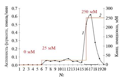 Рис. 5. Очистка процессированного препарата рекомбинантной пропептидазы rProSerP38 T. molitor методом металл-хелатной аффинной хроматографии на Ni2+-NTA агарозе: 1 – активность фермента по субстрату Suc-AAPF-pNA, 2 – градиент концентрации имидазола (мМ).