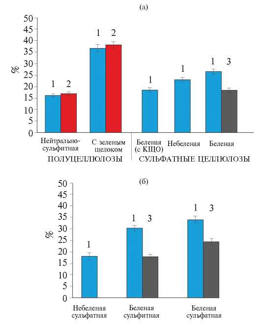 Рис. 1. Показатели выхода глюкозы от абсолютно сухой древесины (%), используемой в технологических процессах получения полуфабрикатов из лиственных (а) и хвойных пород (б): 1 – до высушивания; 2 – после размола; 3 – после высушивания.