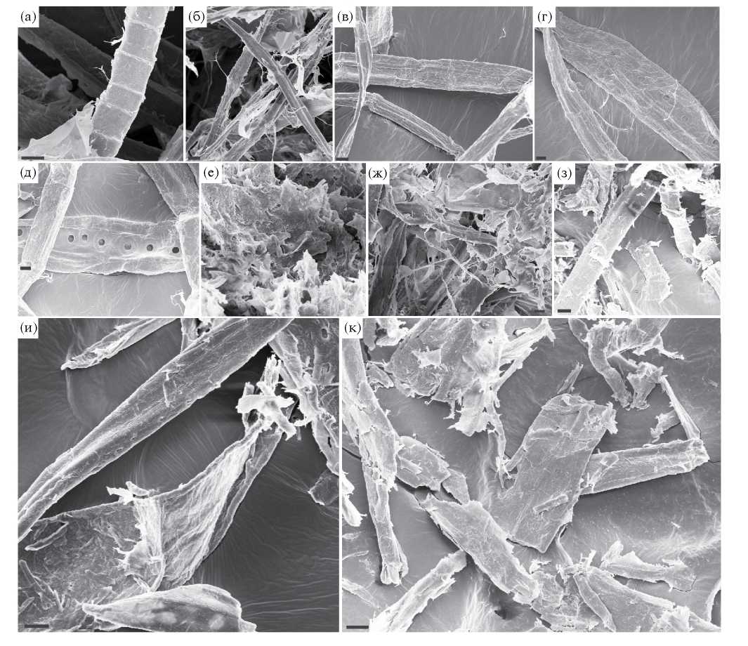 Рис. 2. Электронные микрофотографии образцов исходных волокнистых полуфабрикатов ЦБП и частично гидролизованных карбогидразами P. verruculosum: а – волокна нейтрально-сульфитной полуцеллюлозы; б – волокна полуцеллюлозы, полученной варкой с зеленым щелоком; в-волокна лиственной беленой сульфатной целлюлозы; г – волокна хвойной беленой сульфатной целлюлозы; д – волокна хвойной беленой сульфитной целлюлозы; е – волокна нейтрально-сульфитной полуцеллюлозы после ферментативной обработки (48 ч, степень конверсии 34%); ж – волокна полуцеллюлозы, полученной варкой с зеленым щелоком после ферментативной обработки (48 ч, степень конверсии 39%); з – волокна лиственной беленой сульфатной целлюлозы после ферментативной обработки (22 ч; степень конверсии 50%); и – волокна хвойной беленой сульфатной целлюлозы после ферментативной обработки (24 ч, степень конверсии 62%); к – волокна хвойной беленой сульфитной целлюлозы после ферментативной обработки (24 ч; степень конверсии 48%). Масштабная линейка – 10 мкм.