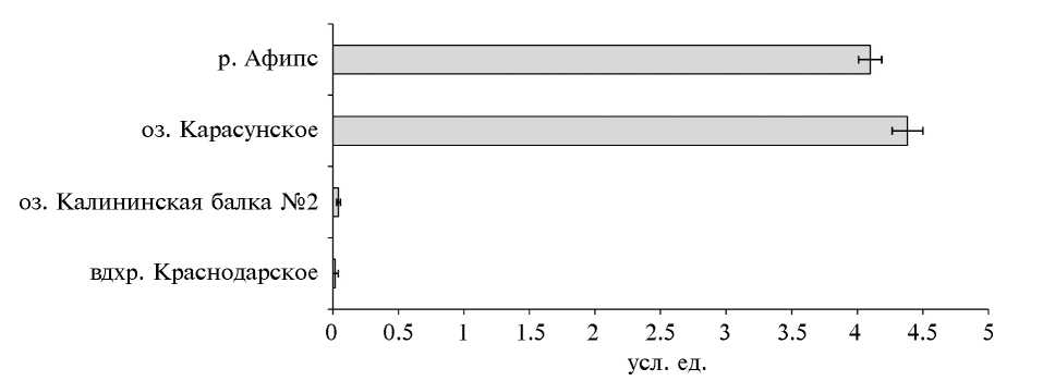 Для оценки связи ключевых ферментативных механизмов, участвующих в обесцвечивании кристаллического фиолетового чистой культурой S. oneidensis MR-1 и смешанными культурами донных отложений различных водоемов Краснодарского края, методом рвПЦР оценивали относительную представленность копий гомологов генов DyP в тотальной ДНК, выделенной из образцов. Для получения стандартных кривых и определения эффективности ПЦР-реакции проводили с серией десятикратных разбавлений ДНК, выделенной из клеточной биомассы S. oneidensis MR-1. В качестве праймеров использовали вырожденные для DyP, а также праймеры для гена 16S рРНК, использованного в качестве гена домашнего хозяйства. Эффективность ПЦР при использованных параметрах реакции составила 1.87 и 1.99 для DyP и 16S рРНК соответственно. Тотальную ДНК, выделенную из образцов донных отложений разных водоемов, использовали в качестве матрицы в сериях амплификаций с праймерами к указанным генам. Относительную представленность выражали как отношение эффективностей ПЦР для референсного гена 16S рРНК к целевому, в степенях соответствующих циклов количественной оценки. Было обнаружено, что гены гомологов DyP представлены в микрофлоре всех образцов донных отложений, значительно варьируя по относительному количеству (рис. 1).