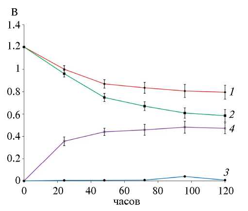 Рис. 2. Динамика разности потенциалов между электродами биоэлектрохимических систем в ходе обесцвечивания кристаллического фиолетового смешанной культурой донных отложений в зависимости от электрической стимуляции внешней цепи. 1 – ионистор прямой полярности подключения. 2 – ионистор обратной полярности подключения (значения приведены по модулю), 3 – резистор 1 кОм, 4 – разомкнутая цепь.