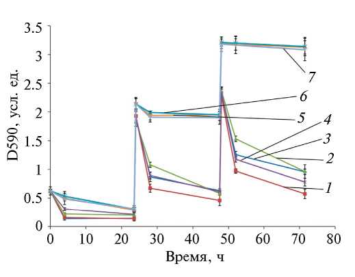 Рис. 3. Динамика D590 раствора кристаллического фиолетового при его ступенчатом внесении, в зависимости от электрической стимуляции внешней цепи. 1 – ионистор прямой полярности подключения. 2 – ионистор обратной полярности подключения, 3 – резистор 1 кОм, 4 – разомкнутая цепь, 5 – контроль без инокулята, 6 – ионистор прямой полярности подключения (контроль с автоклавированным инокулятом), 7 – ионистор обратной полярности подключения (контроль с автоклавированным инокулятом).