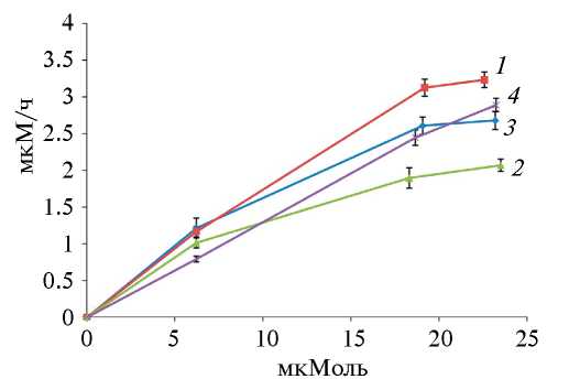 На основании значений ОП590 непосредственно перед внесением очередной порции красителя, а также после него, были построены графики зависимости скорости обесцвечивания от концентрации кристаллического фиолетового, для всех вариантов внешней электрической стимуляции (резистор, подключенные прямой и обратной полярностью ионисторы, разомкнутая цепь). Поскольку наибольшая интенсивность обесцвечивания имела место в первые часы после внесения субстрата, диапазон 0–4 ч представлял наибольший интерес как с теоретической, так и с практической точки зрения, так как проточные системы очистки требуют минимального срока инкубации. Графики зависимости скорости обесцвечивания от концентрации кристаллического фиолетового приведены на рис. 4.