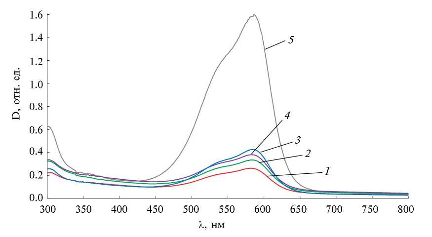 Рис. 5. Спектры поглощения продуктов разложения кристаллического фиолетового смешанной культурой в зависимости от электрической стимуляции внешней цепи. 1 – ионистор прямой полярности подключения. 2 – ионистор обратной полярности подключения, 3 – резистор 1 кОм, 4 – разомкнутая цепь, 5 – контроль.