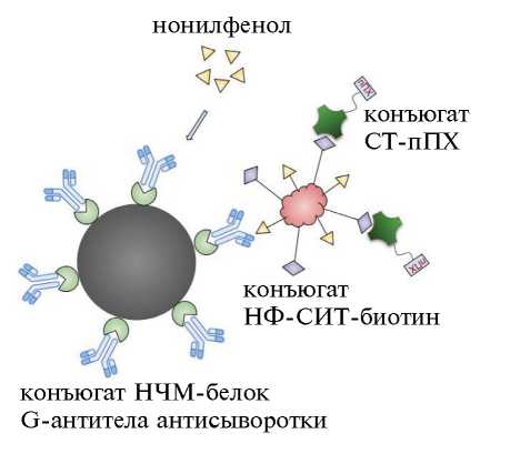 Нонилфенол является ароматическим органическим соединением, обладающим эстрогеноподобным действием и оказывающим негативное воздействие на эндокринную систему человека. Разработана методика конкурентного определения нонилфенола с использованием магнитных частиц, конъюгированных с белком G, антисывороткой кролика, конъюгатом нонилфенола с соевым ингибитором трипсина (СИТ) и биотином. Принцип анализа заключается в формировании иммунных комплексов на поверхности частиц магнетита с помощью белка G путем ориентированной иммобилизации поликлональных антител из сыворотки кролика и последующей конкурентной реакции между нативным нонилфенолом и его конъюгатом нонилфенол-СИТ-биотин за центры связывания антител. Для выявления иммунных комплексов используется взаимодействие с конъюгатом стрептавидин–полипероксидаза, обеспечивающие девятикратный выигрыш по уровню аналитического сигнала по сравнению с конъюгатом стрептавидин-пероксидаза. Предел обнаружения нонилфенола с помощью разработанного ИФА – 3.8 нг/мл, что в 14.5 раз ниже по сравнению с традиционным конкурентным ИФА. Оптимизированный объем тестируемой пробы, равный 500 мкл, позволяет концентрировать аналит в 17 раз.