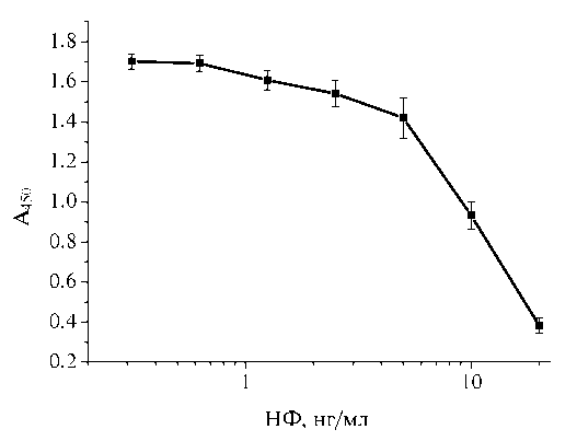 Конкурентный иммуноферментный анализ НФ. В лунки микропланшета (Corning Costar, США) вносили конъюгат НФ-СИТ (1 мкг/мл) в ФБС и инкубировали в течение ночи при 4°C, а затем трижды промывали 50 мМ ФБС, содержащим 0.05% Твин-80 (ФБСТ). Далее 150 мкл ФБС с 0.1% желатином вносили в лунки микропланшета и инкубировали 30 мин при 37°C, после чего микропланшет промывали ФБСТ. Для приготовления растворов НФ использовали исходный метанольный раствор с концентрацией 1 мг/мл. В лунки вносили растворы НФ с различной концентрацией (от 100 мкг/мл до 0.01 нг/мл) в смеси метанол : вода (1 : 4), а затем добавляли антисыворотку в разведении 1 : 5000 в ФБС с 0.1% желатина. После инкубирования в течение 1 ч при 37°C и отмывки планшета ФБСТ добавляли конъюгат антивидовые антитела – перокси даза (1 : 3000) и инкубировали 45 мин при 37°C и интенсивном перемешивании. Микропланшет отмывали 4 раза ФБСТ, вносили в лунки раствор субстрата ТМБ (100 мкл) и через 15 мин инкубации при комнатной температуре останавливали реакцию добавлением 50 мкл 0.1 М H2SO4.