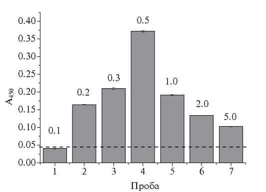 Выбор концентрации конъюгата НФ-СИТ-биотин проводили при ее варьировании от 5 до 0.6 мкг/мл. Критерием выбора было достижение наиболее высокого значения оптической плотности; была выбрана концентрация конъюгата 5 мкг/мл (рис. 6).