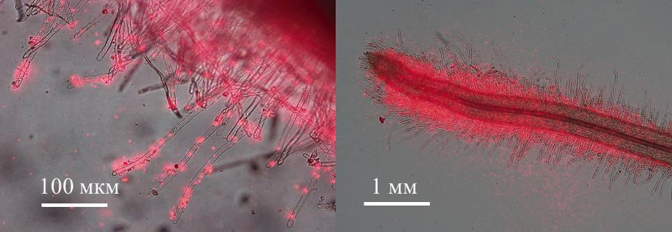 Рис. 1. Адгезия меченых RFP бактериальных клеток на поверхности корневых волосков проросших семян гороха под флуоресцентным микроскопом AxioImager M1 (“CarlZeiss”, Германия).