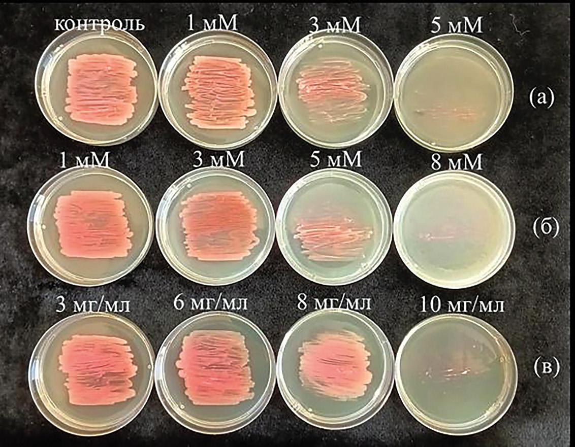 Рост штамма Pseudomonas sp. OBA 2.4.1. на питательных средах с ТМ и глифосатом. Микроорганизмы могут по-разному переносить токсичность металлов [3]. Устойчивые к воздействию ТМ штаммы бактерий, обладающие ростостимулирующим действием, имеют особую ценность. В рамках нашего исследования был изучен рост штамма Pseudomonas sp. OBA 2.4.1 на средах с добавлением различных концентраций ТМ и гербицида. Показано, что на средах с добавлением NiCl2 до 3 мМ он способен активно расти, а при концентрации 5 мМ роста не было (рис. 2а). При посеве штамма на среды с различными концентрациями Pb(CH3COO)2 было показано, что он был способен расти на среде LB с добавлением 3 мМ Pb(CH3COO)2, а при внесении 5 мМ было заметно значительное угнетение роста бактерий, а при 8 мМ роста уже практически не наблюдалось (рис. 2б). На средах с добавлением глифосата Pseudomonas sp. OBA 2.4.1 рос при концентрации до 6 мг/мл, ингибировался при 8 мг/мл, при 10 мг/мл роста бактерий не было (рис. 2в).